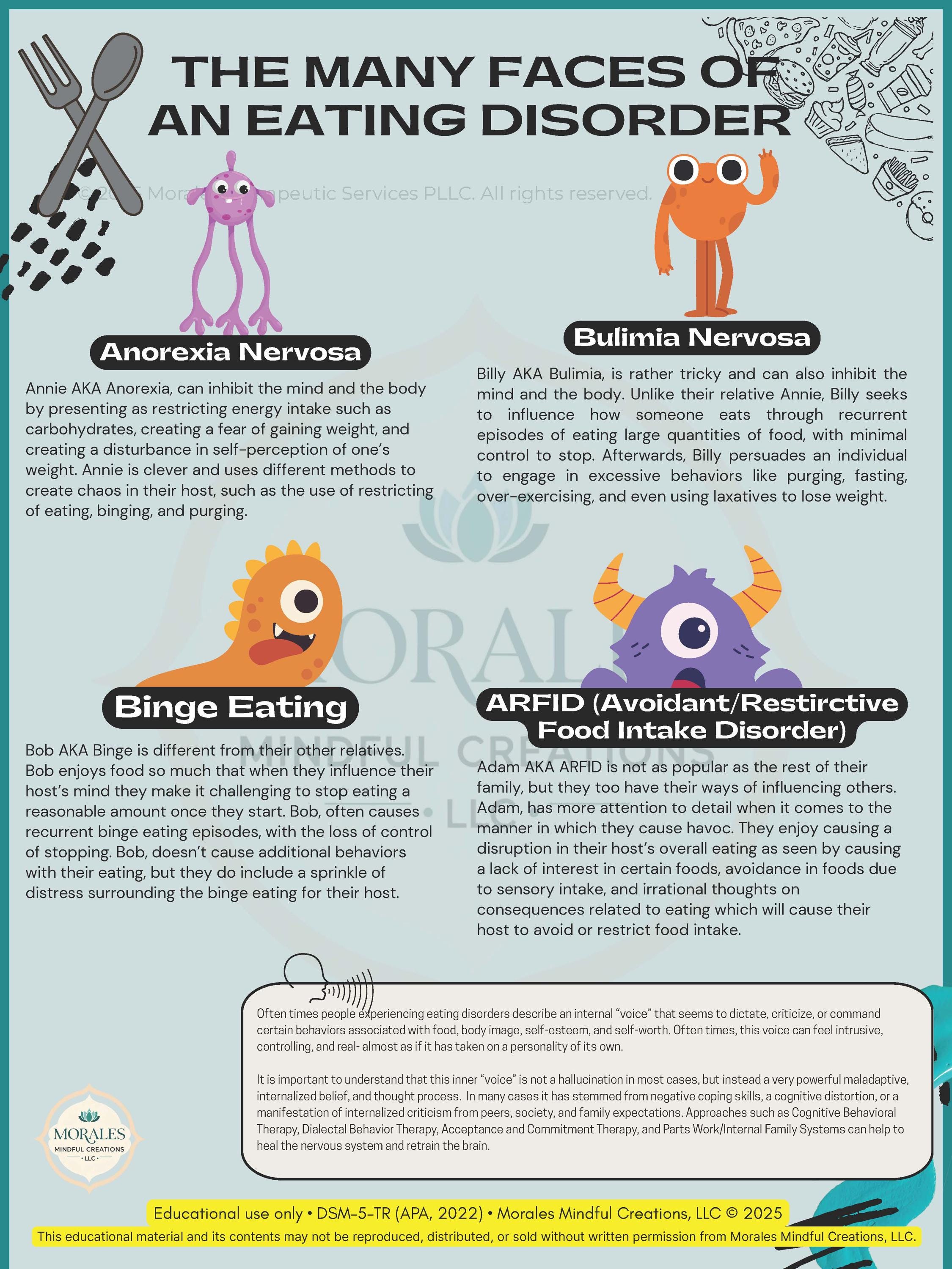 This beautifully designed, full-color 1-page informational sheet provides a clear and concise overview of the most common eating disorders, including Anorexia Nervosa, Bulimia Nervosa, Binge Eating Disorder, and Avoidant/Restrictive Food Intake Disorder (ARFID). Each section includes hallmark symptoms, risk factors, and key differences to help with education, awareness, and early identification.